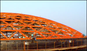 ![]() ![]() ![]() CWD系列網(wǎng)殼采用先進(jìn)的承插式節(jié)點(diǎn)體系,將一系列鋼構(gòu)件連續(xù)成三角形網(wǎng)格系列,組成立式圓筒形儲(chǔ)罐的拱形頂蓋網(wǎng)殼。采用經(jīng)過(guò)優(yōu)化設(shè)計(jì)的短程線結(jié)構(gòu),受力性好、空間剛度大抗震性能優(yōu)越;用材方面,用材方面,與原板肋式頂蓋結(jié)構(gòu)相比,可節(jié)省鋼材20-30%,直徑越大,效果越明顯。同時(shí),該網(wǎng)殼采用工廠化、定型化制作。精度高,殼體成型美觀,而且安裝快速簡(jiǎn)便,不需大型吊裝設(shè)備,基本無(wú)焊接工作量,加快了工作進(jìn)度,蒙皮板只做維護(hù)結(jié)構(gòu)與網(wǎng)殼桿件,不焊接,便于因應(yīng)換頂。 本公司生產(chǎn)鋼網(wǎng)殼的同時(shí)還生產(chǎn)鋁合金網(wǎng)殼,具有遠(yuǎn)大的發(fā)展前景。鋼網(wǎng)殼頂蓋不僅適用于大型拱頂與內(nèi)浮頂儲(chǔ)罐的頂蓋支承結(jié)構(gòu),還能推廣至氣柜等其它儲(chǔ)存裝置上。網(wǎng)殼、蒙皮防腐由罐體設(shè)計(jì)中確定。